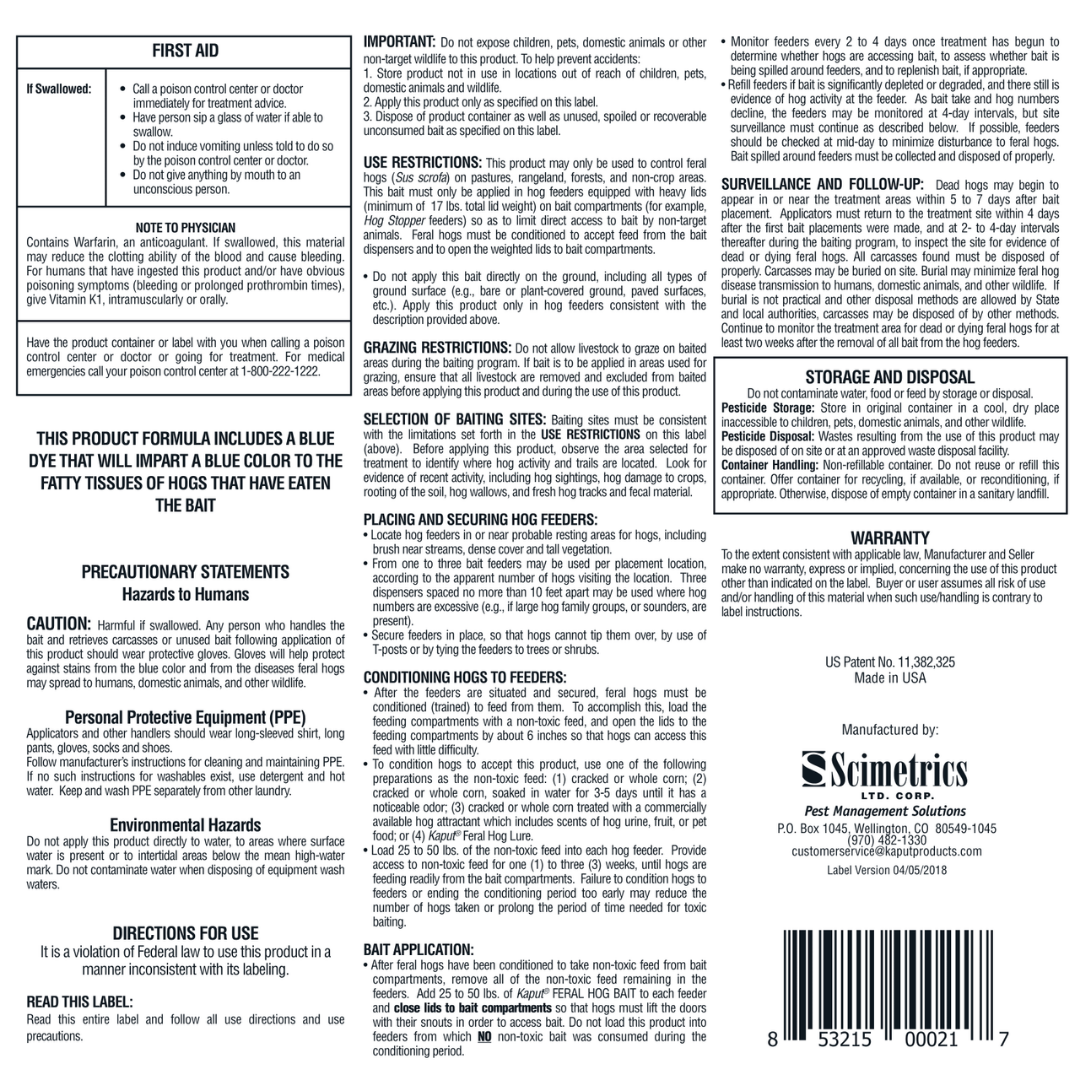 Kaput Feral Hog bait is a Category IV pesticide for use in specified feeders for small groups of hogs. Read all labels and instructions before using. All users must attend training to ensure that they are aware of the proper use of this product and obtain all necessary licensing. Please click below for more safety information.