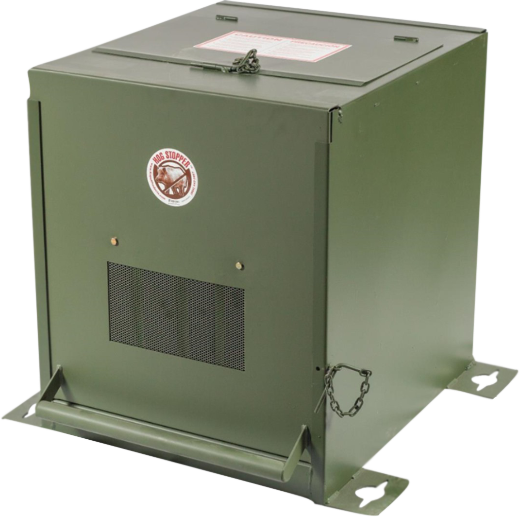 In order to use Feral Hog Bait properly, the bait must be placed in the correct type of feeder. These should have a weighted lid (vertical or angled) of at least 17 pounds, be staked securely to the ground with T-posts (or tied to trees), and should be placed no more than 10 feet apart.